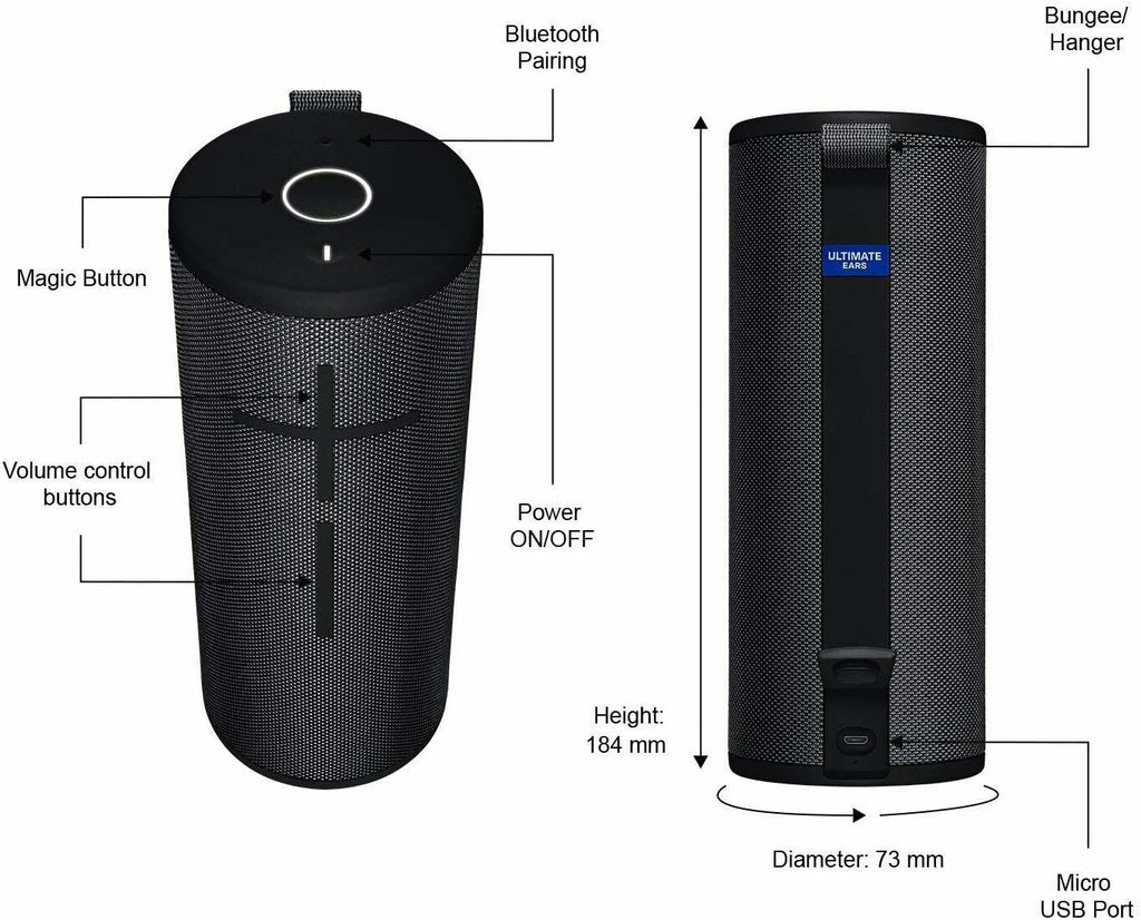 Ultimate Ears Boom 3 Bluetooth-Lautsprecher stehen für einzigartige Klangverarbeitung. Die kabellosen, wasserdichten Bluetooth-Lautsprecher geben Lieblingsmusik klar und ausgewogen wieder – bei jeder Lautstärke. Selbst am Strand, am Pool oder am See kann sorglos Musik gestreamt werden. Nehmen Sie das kompakte Leichtgewicht einfach überall hin mit. Der Lautsprecher ist nicht nur wasserfest, sondern auch staubdicht und sturzsicher. Beim Klang trumpft der BOOM 3 trotz seiner Kompaktheit groß auf. Genießen Sie besten 360-Grad-Sound, tiefen Bass und One-Touch-Musiksteuerung. Das unverkennbare zylindrische Design – eigens von Ultimate Ears entwickelt – sorgt für eine raumfüllende Klangausgabe in Stereo-Qualität, die gleichmäßig in alle Richtungen strahlt. Im Gegensatz zu vielen tragbaren Lautsprechern verleiht der kabellose Ultimate Ears Boom 3 der Musik eine satte, intensive Bass-Struktur für eine wirklich authentische Musikwiedergabe – ganz ohne Überspitzung oder Verzerrung. Logitech Boom 3 ist extrem strapazierfähig und hat mehr als 25 anspruchsvolle Haltbarkeitstests bestanden, darunter mehrere tausend Male Tastendrücken, eine Vielzahl an Sturztests und mehr. Der wasserfeste, kabellose Lautsprecher ist mit einem harten und attraktiven Performance-Gewebe beschichtet. Dieses wurde ursprünglich zur Verarbeitung in Motorradjacken und Brandschutzkleidung entwickelt und ist speziell für extreme Anforderungen konzipiert. Der kabellose Lautsprecher von Ultimate Ears verwendet dieselbe Akkutechnologie wie einige der gefragtesten Elektroautos und läuft durchschnittlich 15 Stunden. Er ist wasserdicht und staubdicht gemäß der IP67-Schutzklasse, kann bis zu 30 Minuten lang ins Wasser eingetaucht werden – und kann sogar schwimmen. Anschließend funktioniert er problemlos weiter. Frequenzbereich: 90 Hz - 20 kHz. Kabelloser Bluetooth-Lautsprecher – wasserdicht – USB-Kabel – Bedienungsanleitung 2 Jahre Herstellergarantie. KOMPATIBILITÄT: Für die Audiowiedergabe: Smartphones, Tablets und andere Geräte, die Bluetooth und Bluetooth Smart Wireless Audio Profile unterstützen [Advanced Audio Distribution Profile (A2DP)]